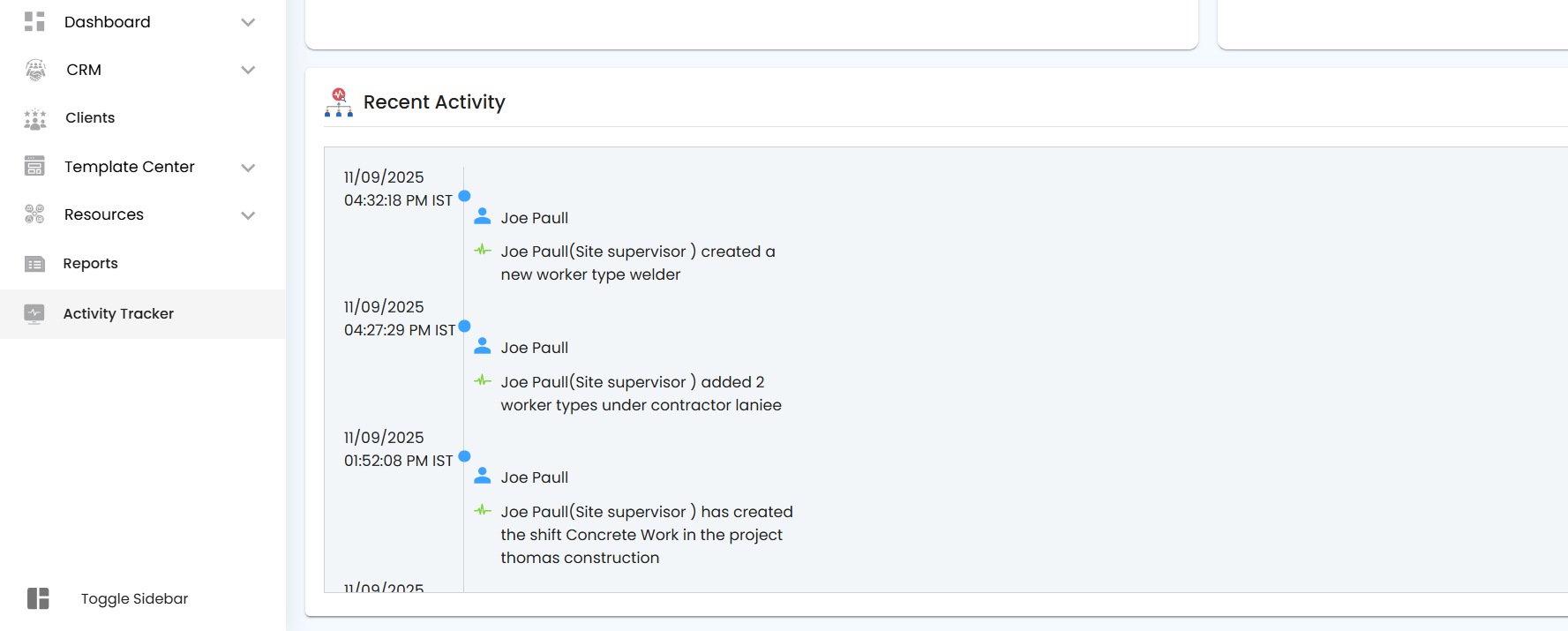 The Recent Activity card shows the latest actions within the organization, along with the date, time, and time zone, helping you stay updated on recent changes and activities.