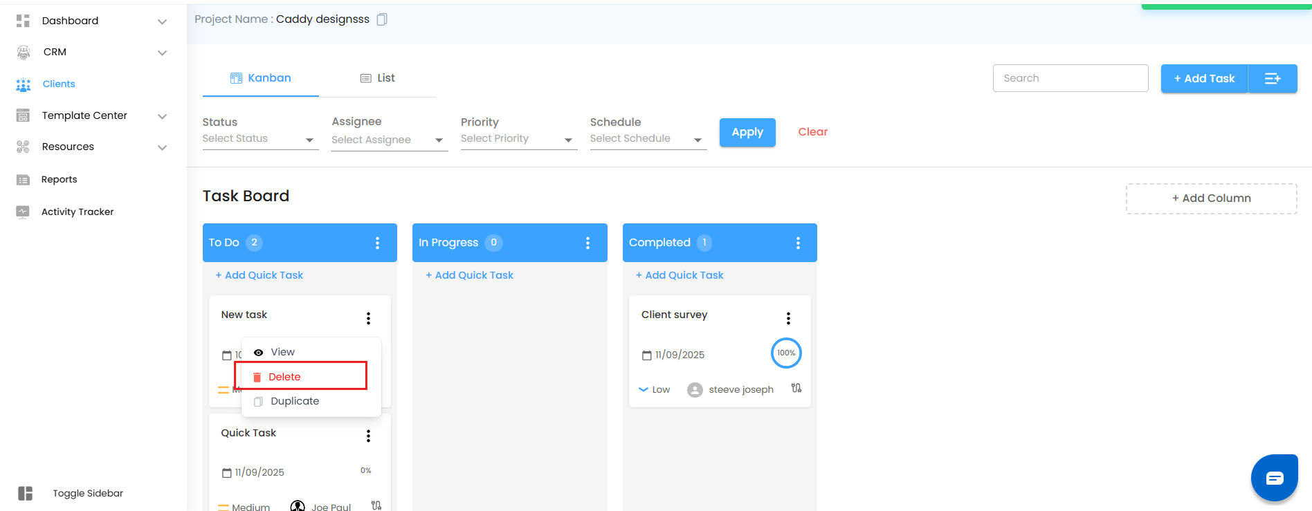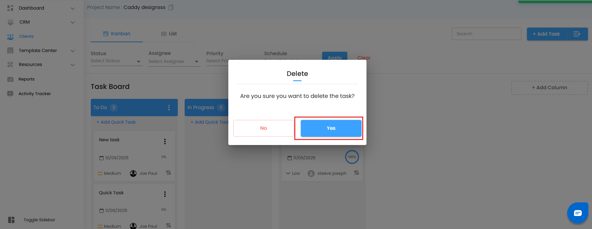Yes, Delete – The task vanishes instantly from the board, keeping your workspace sharp and focused.