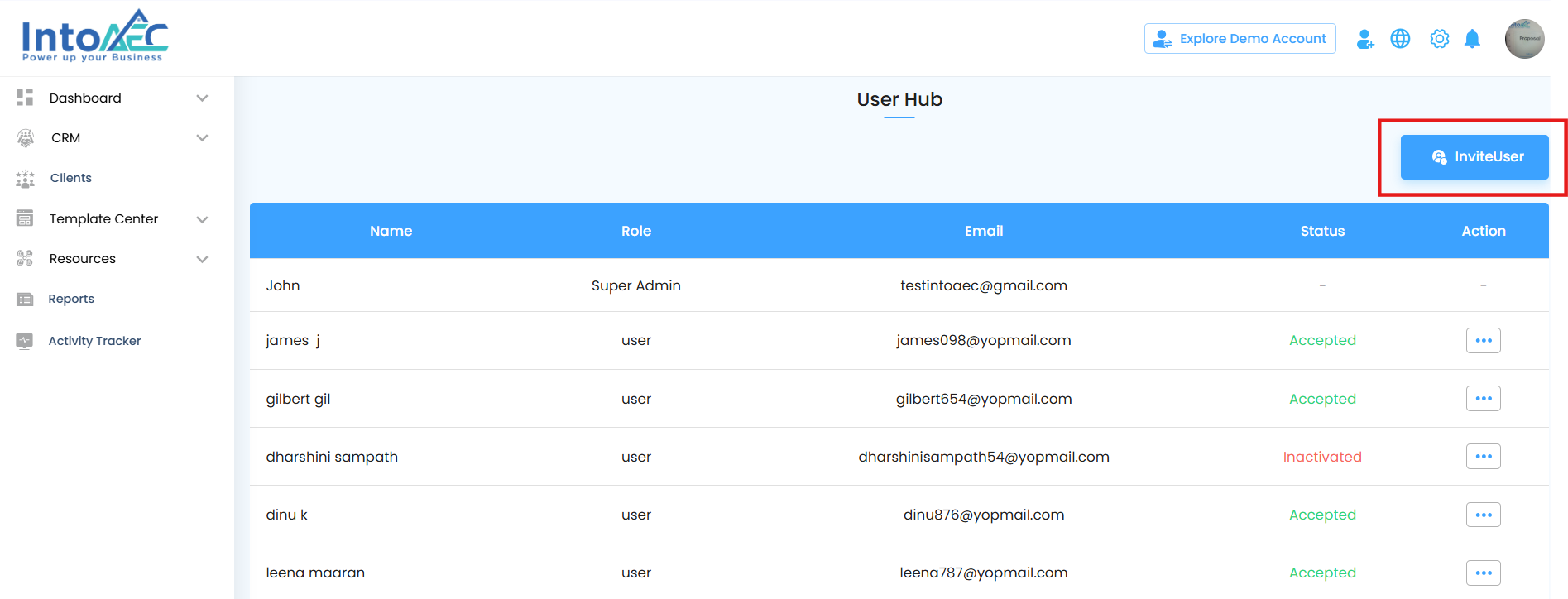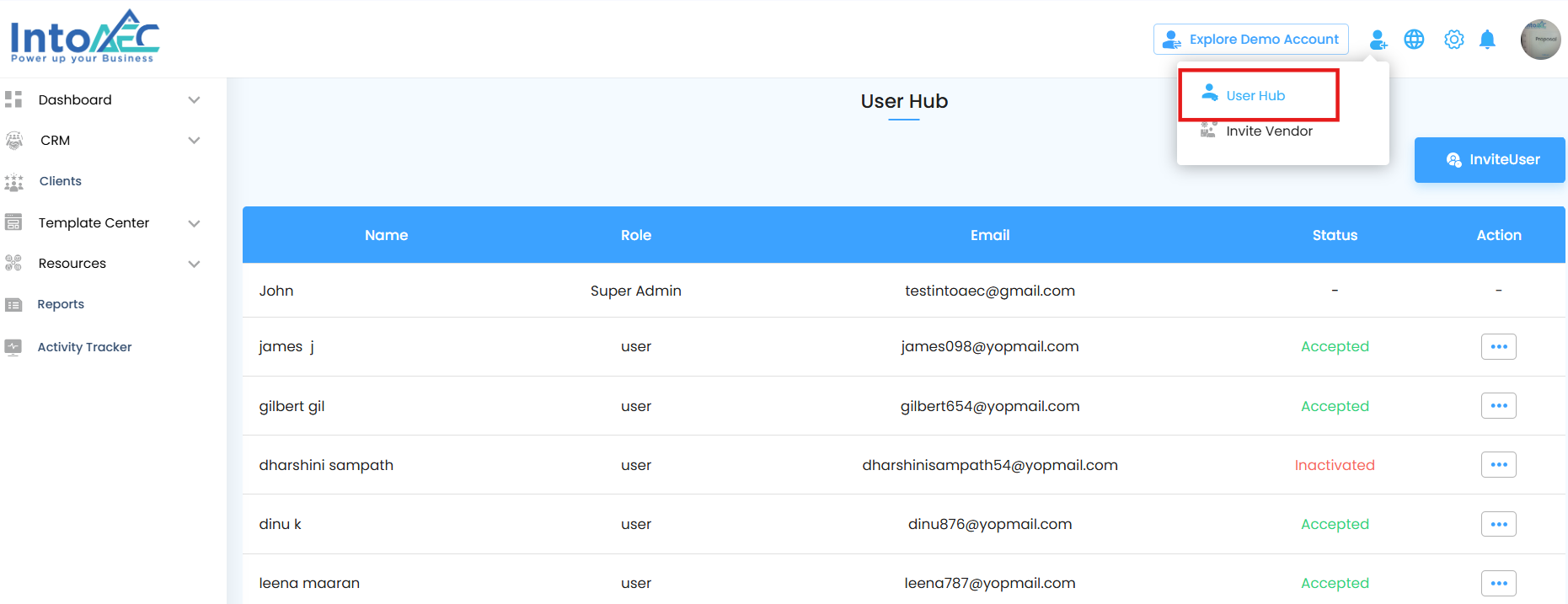 - Open User Hub Page: The User Hub page will open, where you can manage all user-related actions such as invitations, permissions, and status updates.