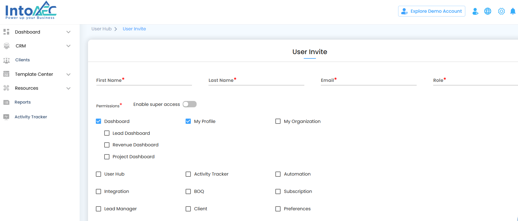 - Open User Invite Form: The User Invite Form will appear, where you can enter the user’s details and configure their access preferences.