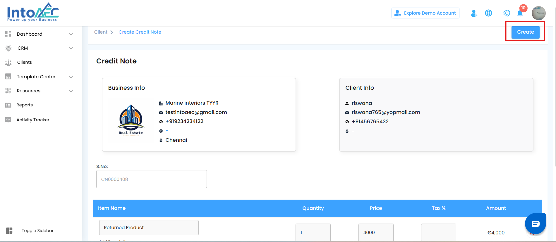 Click the Create button on the Credit Note page
