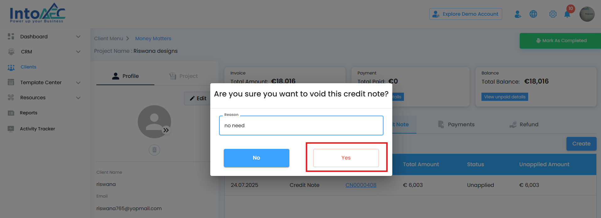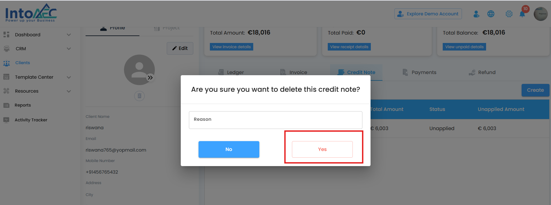 Click yes to permanently delete the credit note.