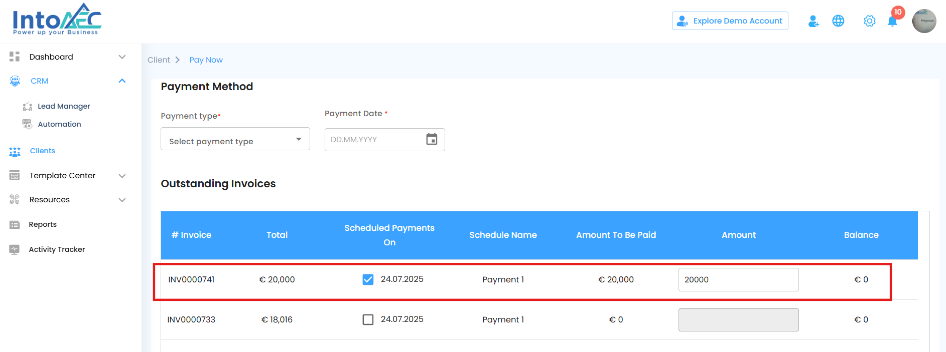 - Amount-This is the field where you enter the amount you are currently paying for the selected schedule or invoice.