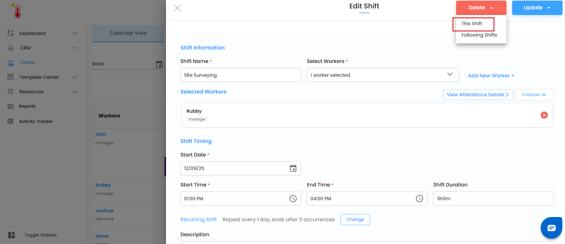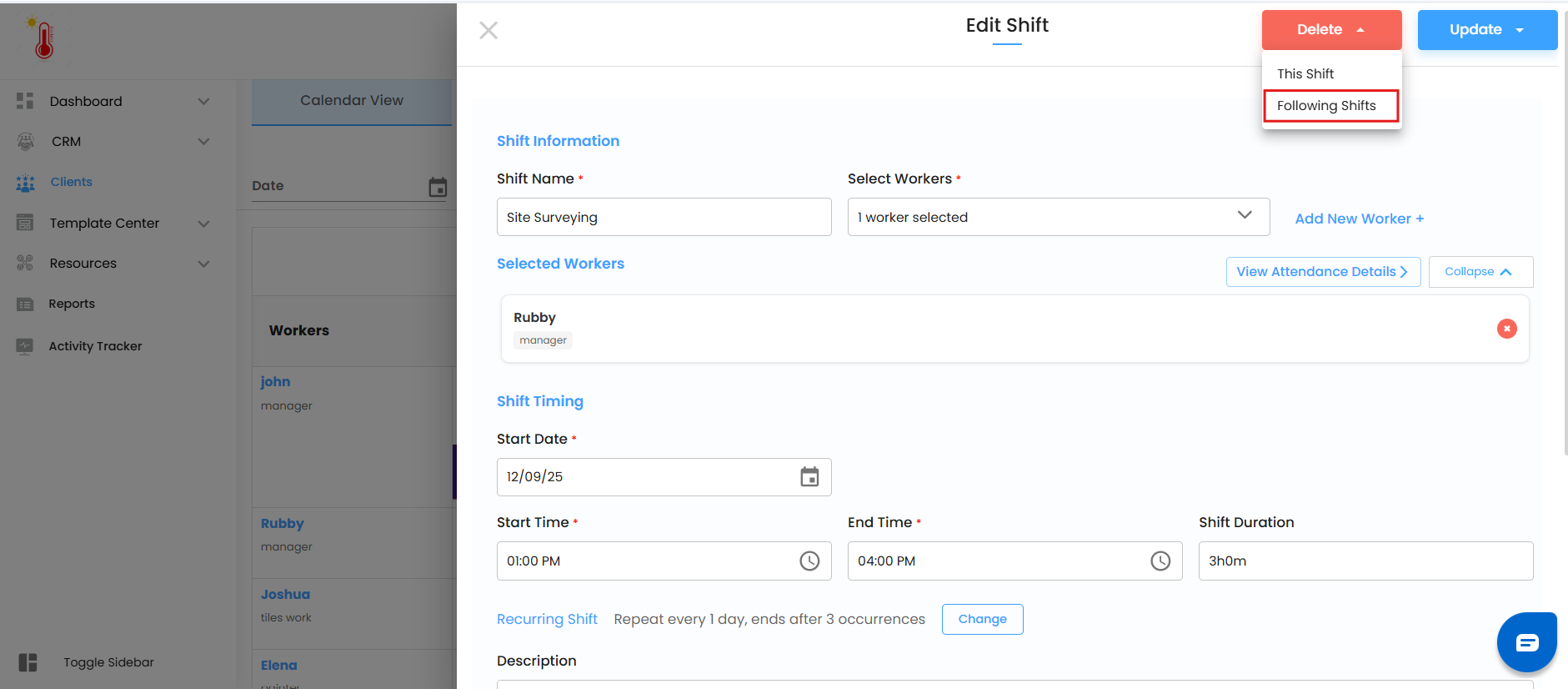- Popup confirmation: - “Are you sure you want to delete this shift and following shifts?”