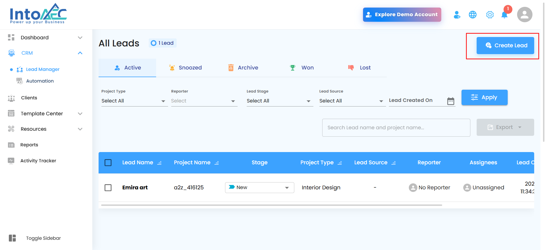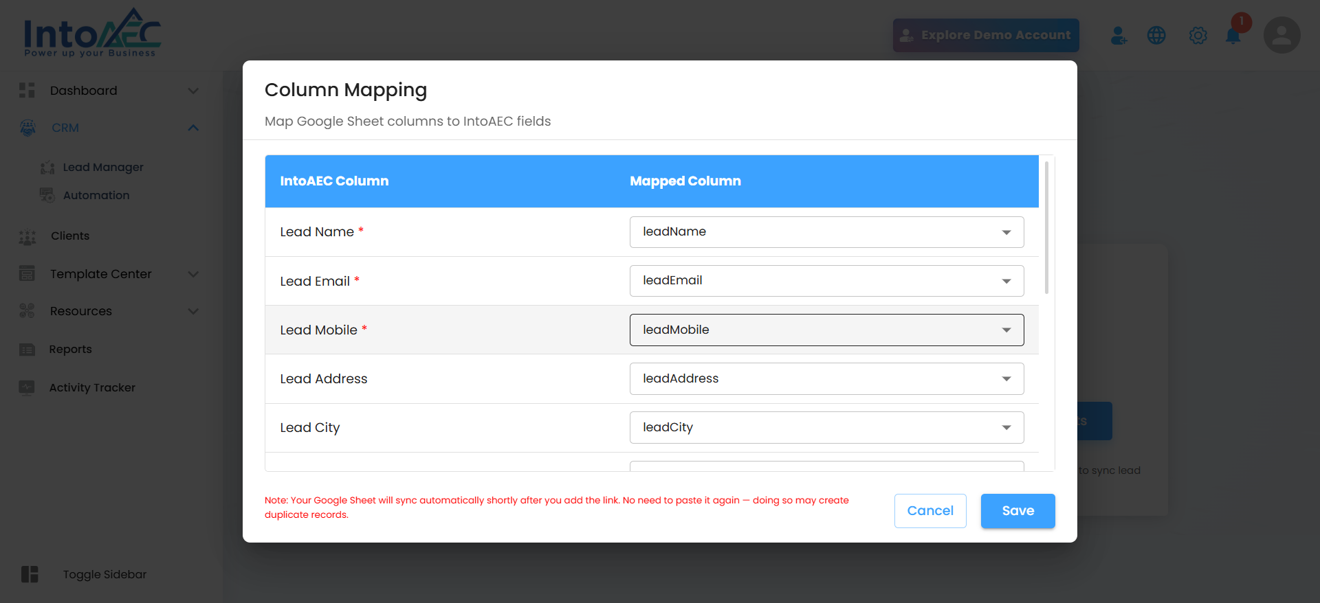 - Review the list of IntoAEC Columns (for example, Lead Name, Email, Mobile, etc.).