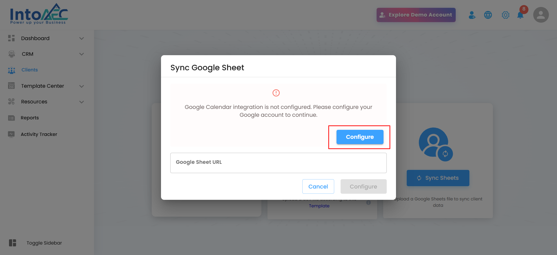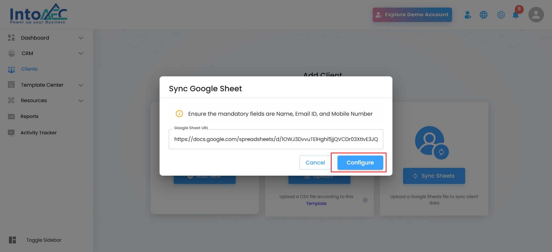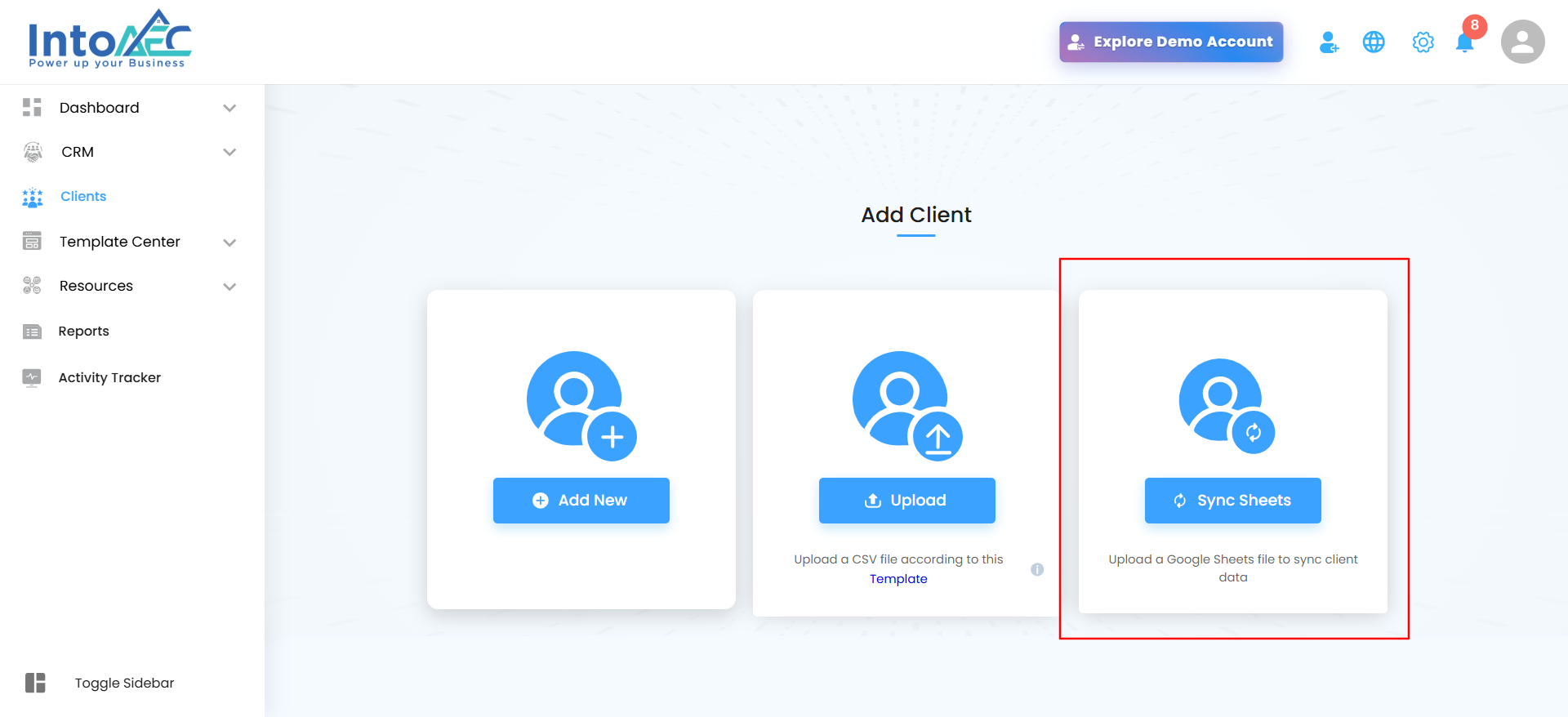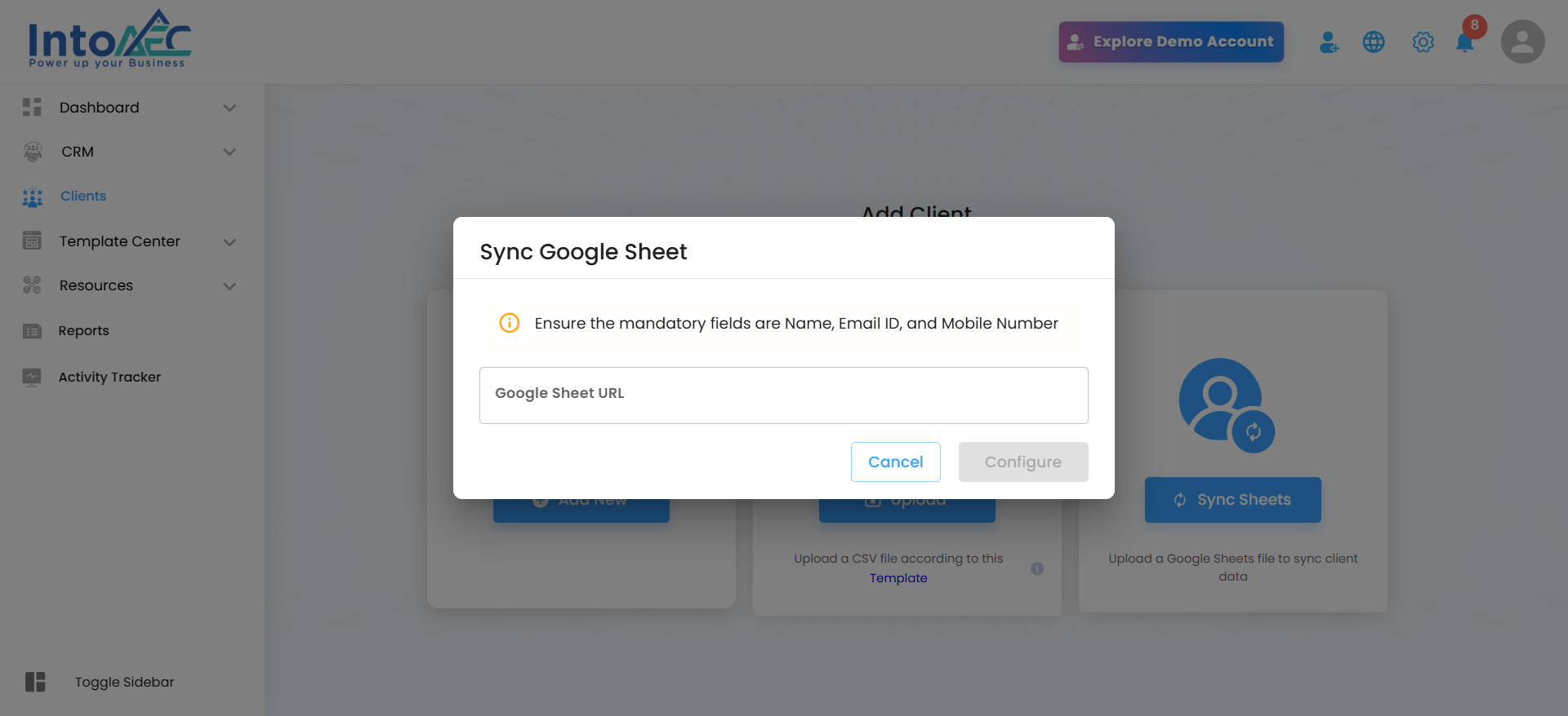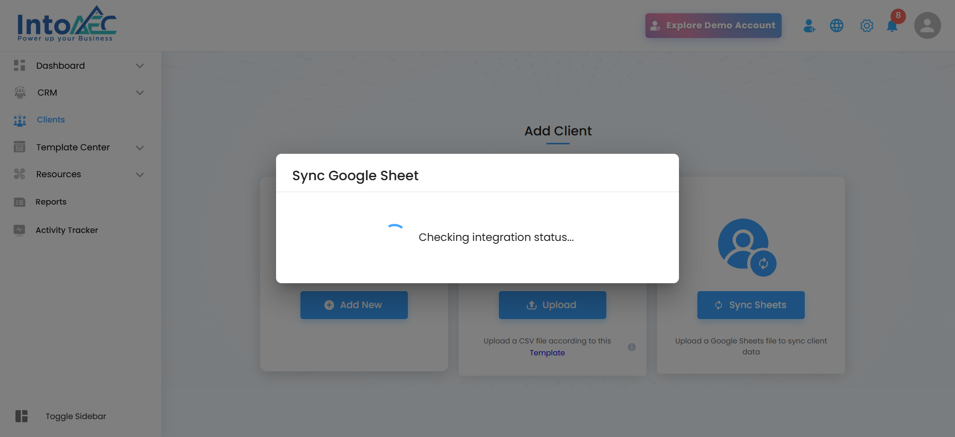 Tired of manually entering client details? With Google Sheets integration, you can bring your client data straight into IntoAEC quick, seamless, and perfectly organized. Whether you’re managing a handful of clients or hundreds, syncing your sheet keeps everything accurate and instantly accessible inside your CRM.
