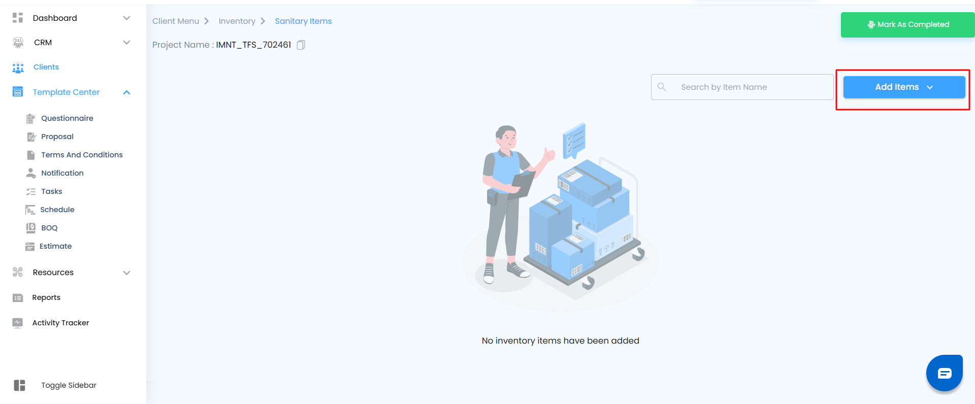 Head to your project workspace and navigate to the Inventory section. - Open the Add Items Menu