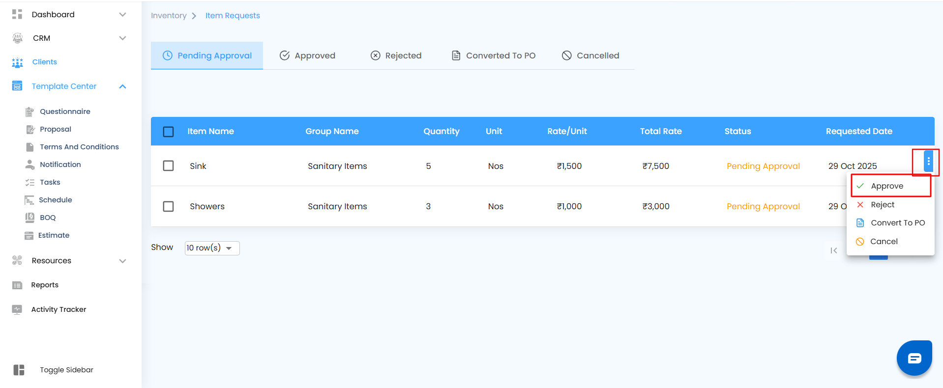 - Navigate to Inventory → Item Requests → Pending Approval.