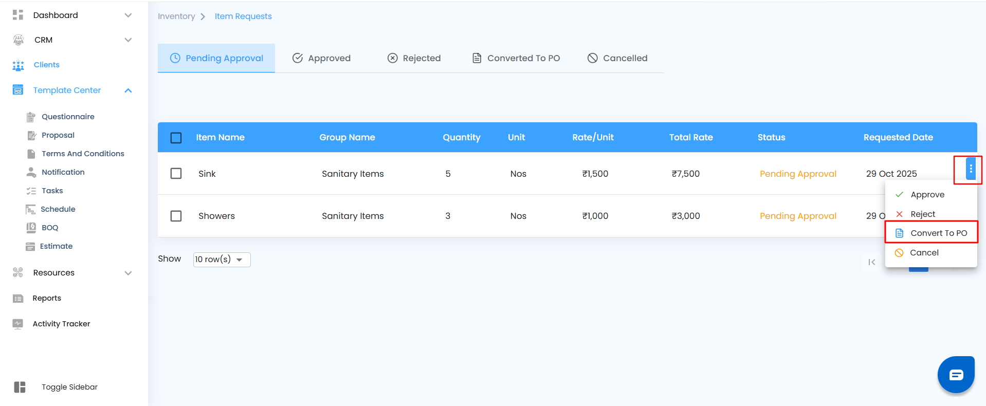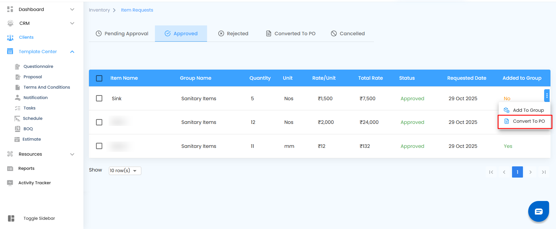 - Convert to PO – Instantly transform the approved request into a Purchase Order and move it forward in the procurement process.