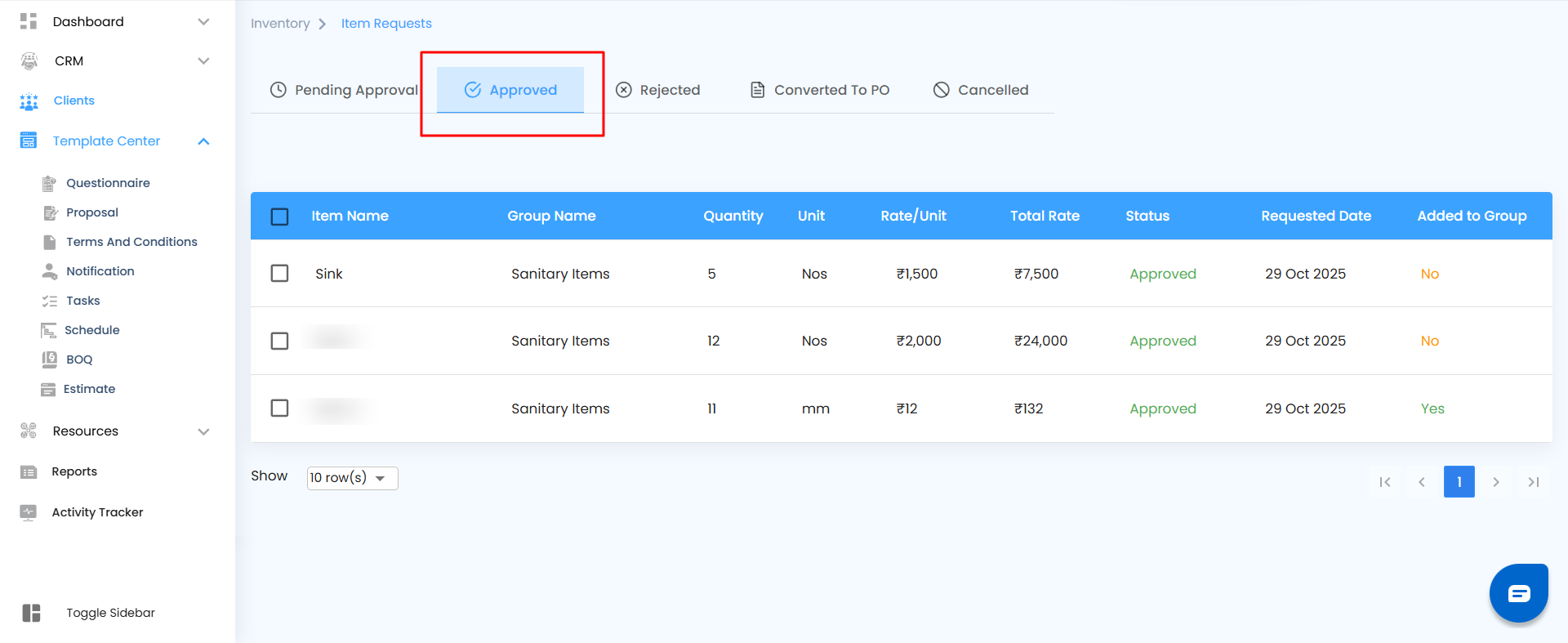 Once approved, each item is neatly displayed with complete details—its group, quantity, rate, total cost, and approval date—giving you instant visibility into what’s been cleared and what’s next in line.