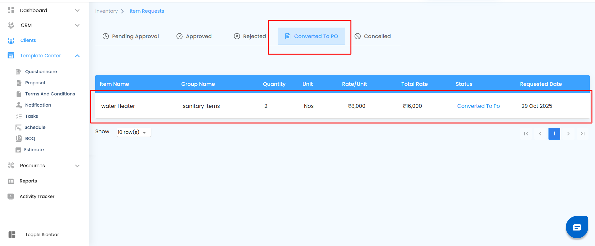 The Converted to PO tab lists all item requests that have been successfully turned into Purchase Orders. Once a request is converted, it automatically moves here from the Approved stage.