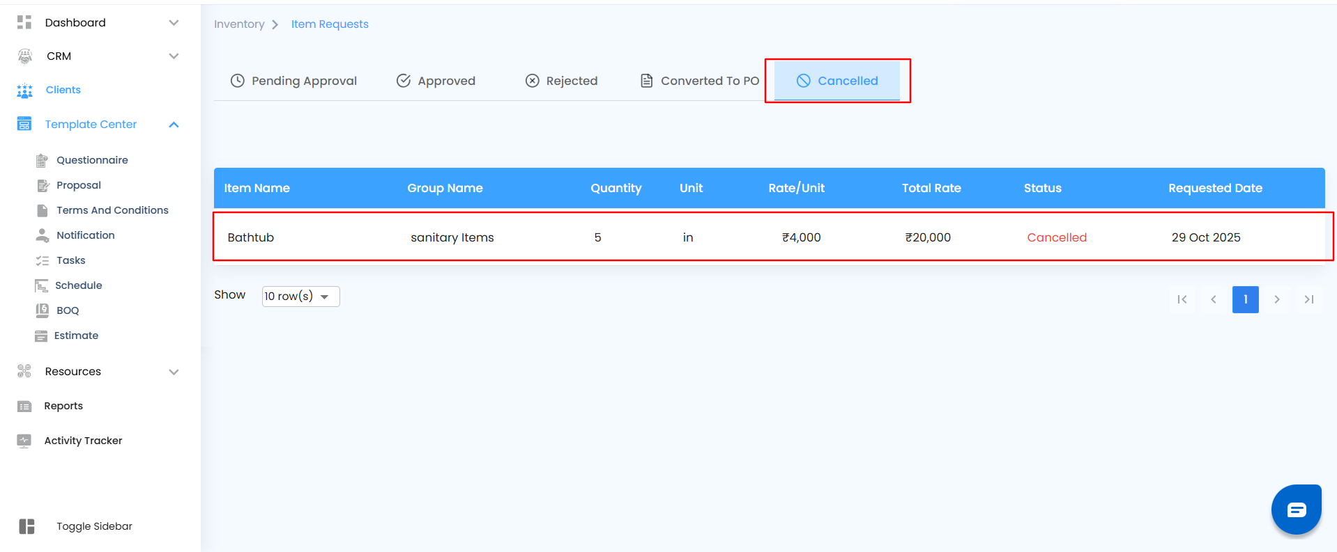 Any requests that have been withdrawn or manually cancelled appear in the Cancelled tab. This ensures clear visibility into items that were previously raised but later stopped before approval or conversion.