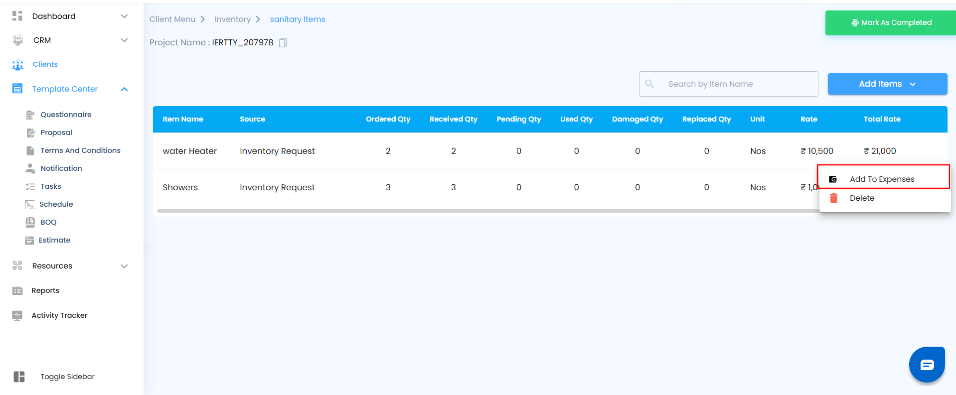 This instantly converts the item into an expense entry, linking it to your project’s cost tracking.